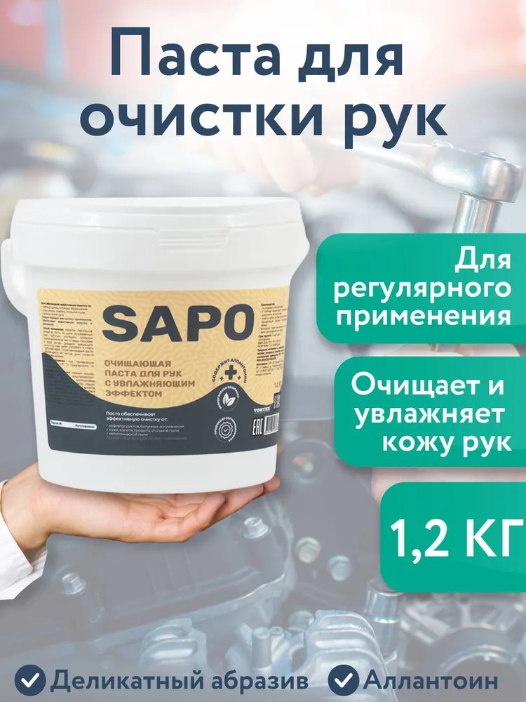 SAPO — профессиональная очищающая паста для глубокой очистки кожи рук после любых видов работ. Продукт специально разработан для быстрого и деликатного удаления стойких загрязнений, таких как: